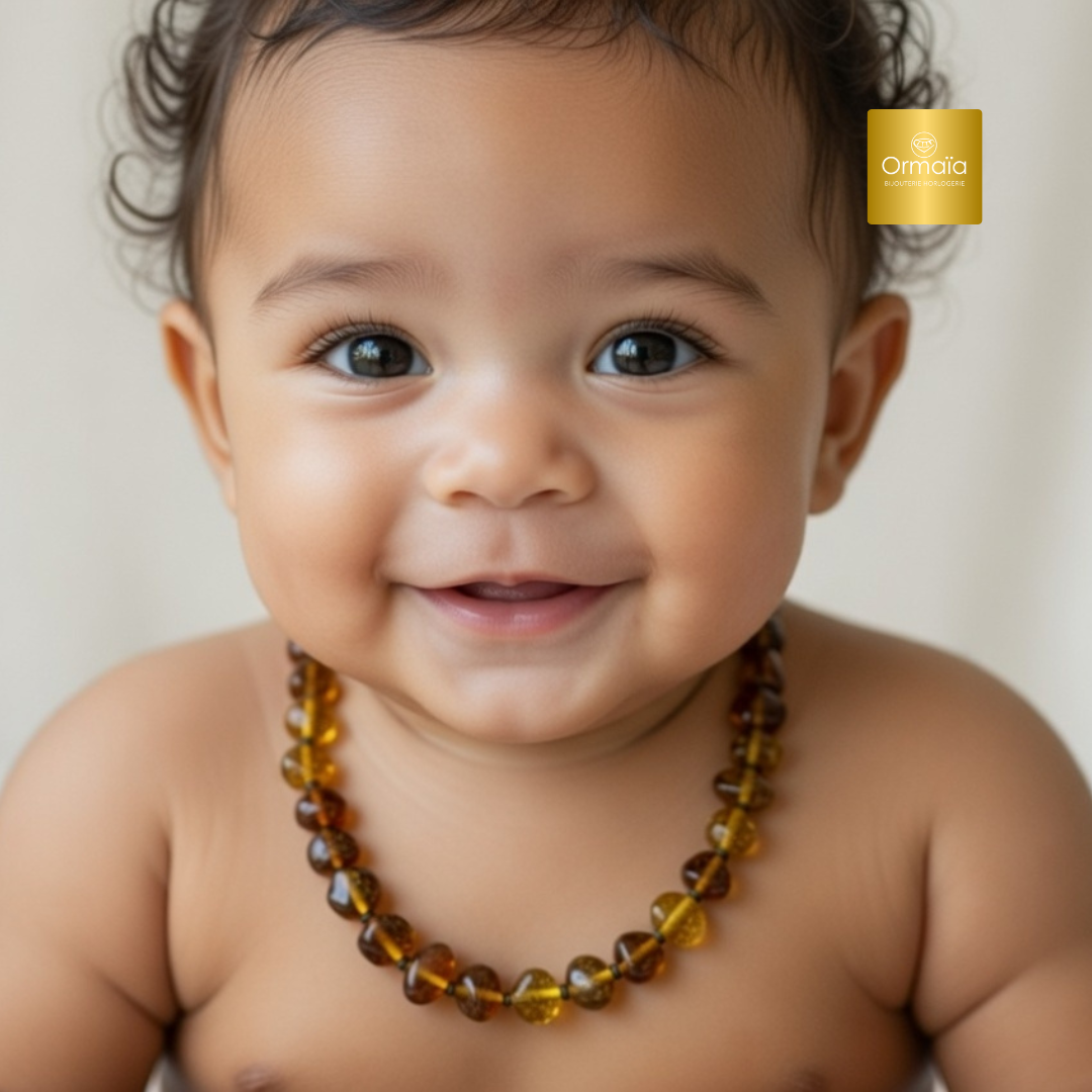 Découvrez nos colliers tricolore ou bicolore en ambre couleur cognac et/ou miel pour enfants, d’une longueur de 32-33 cm.